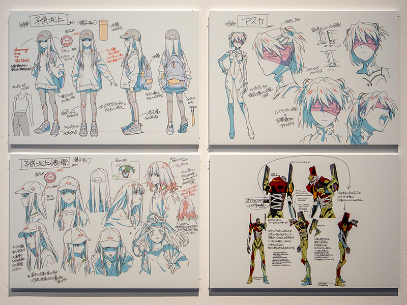 本展示第3章以降で扱われる『新劇場版』以降の作品は、着彩以降の工程がデジタルに移行したため、「形ある物」としてのセル画は存在しない。それに変わって展示されるのが「レイアウト」や「原画」など、紙に鉛筆や色鉛筆を使って人の手で描かれた「作画」行程の資料群だ。展示では、一点一点にはキャプションを置かず、膨大な数のレイアウトや原画が展示スペースいっぱいにわけへだてなく展開している。