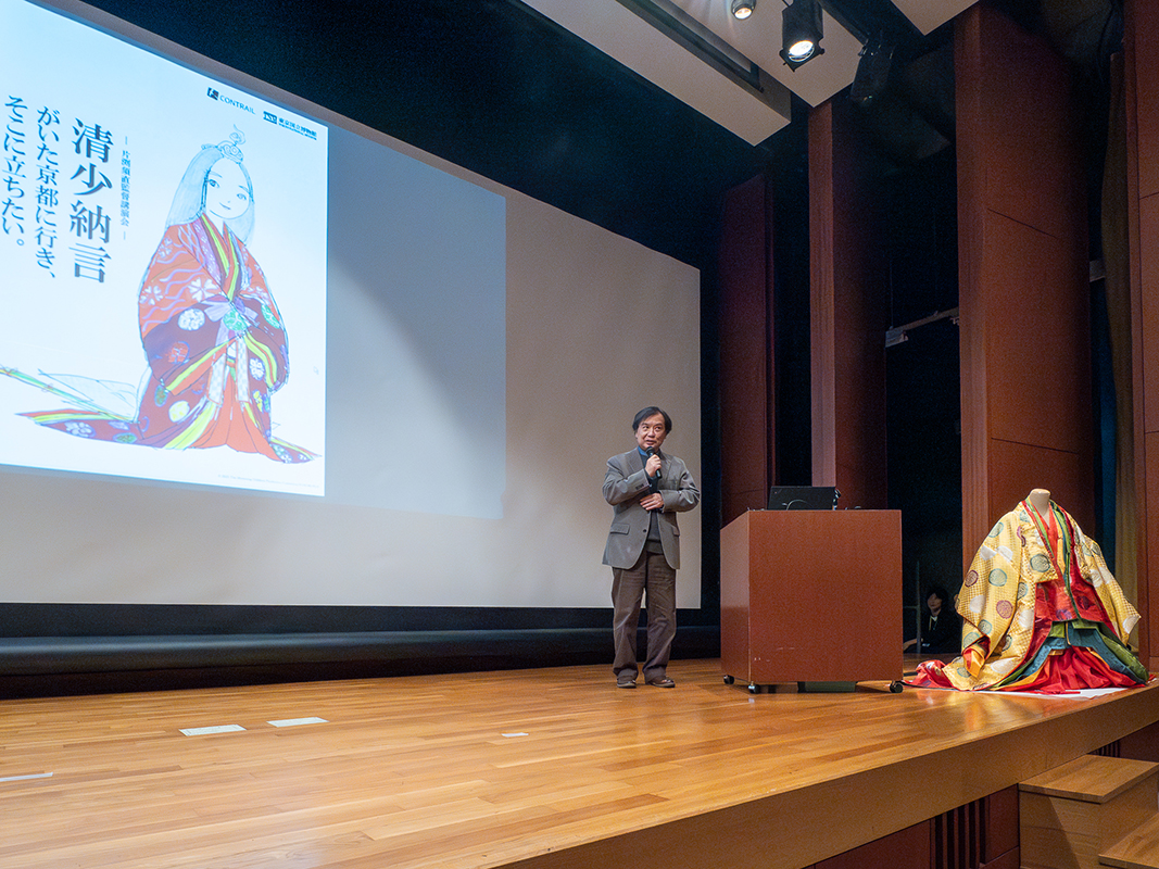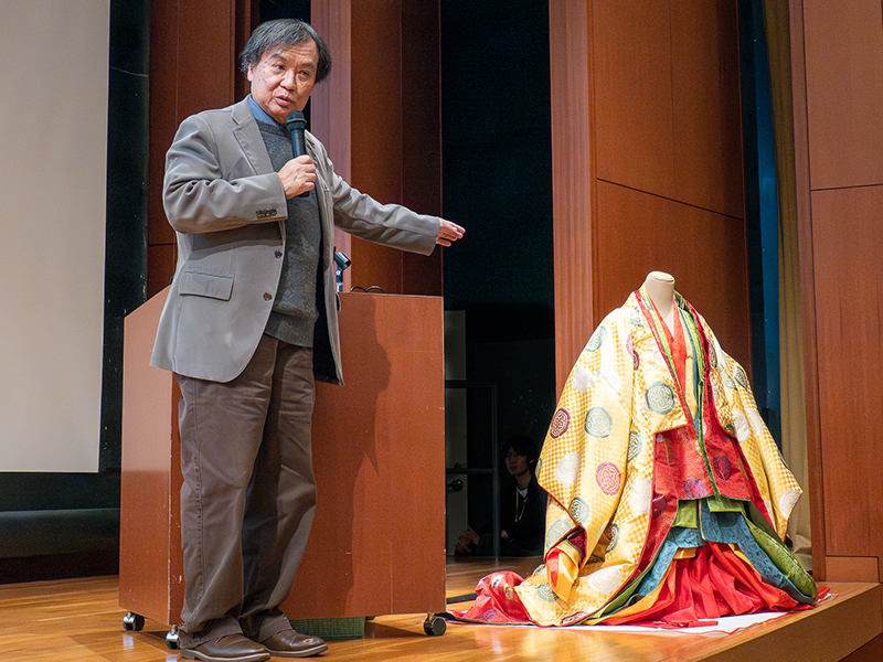 講演会が開催された大講堂では、壇上の上手には復元された小袿(こうちき)、下手には、これまでそうしたものがあることがほとんど指摘されずにいた裳唐衣(もからぎぬ)装束の夏服が展示され、平安時代の息使いが来場者の視覚に訴えてくる。