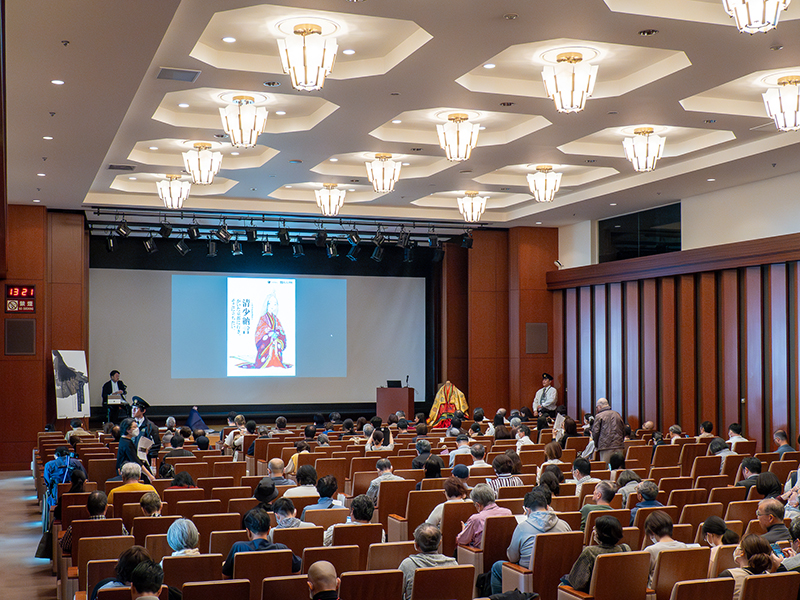 今回の講演会は、高い関心を集め、定員380名に対して1000名を超える応募が寄せられた。さらに、講演会の開催にあわせて「『つるばみ色のなぎ子たち』制作資料展」も開催。『つるばみ色のなぎ子たち』は、片渕監督が制作中の長編アニメーション映画であり、『枕草子』の作者・清少納言が生きた平安時代を舞台とする。講演会の客席には、女性の姿も目立ち、平安時代への関心の高さがうかがえた。