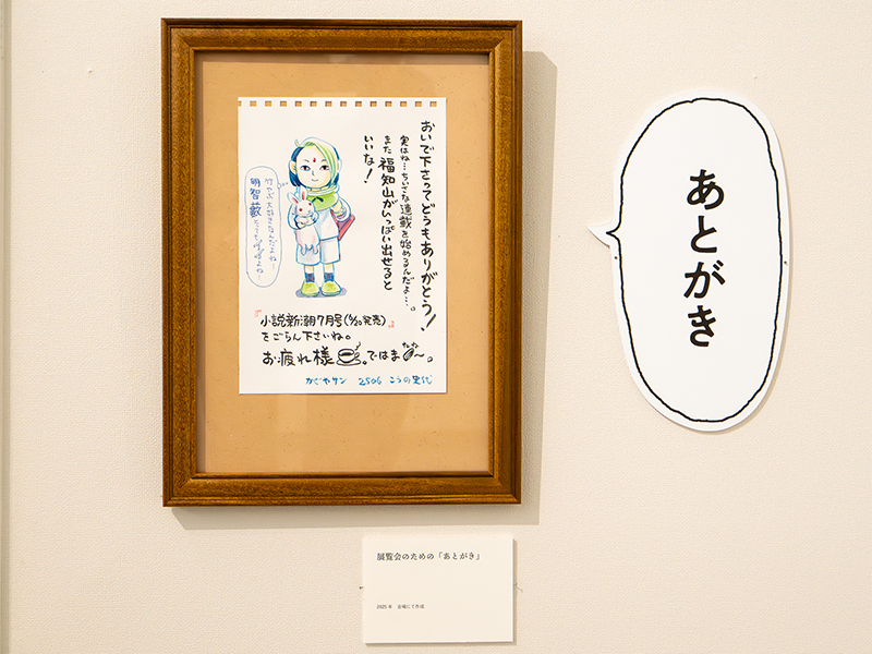 2025年6月8日からの福知山展は、巡回展2カ所目。福知山市は、こうの史代が現在居をかまえる地。2016年の移住以来、イラスト「麒麟のいる街」の発表や、福知山マラソンへの参戦や観戦、ボランティア参加、参加賞への描き下ろしイラスト提供など、地元を軸足に置いた活動にも積極的。直近では、図書館雑誌スポンサー制度(※1)でこうの史代が6誌の雑誌を提供している、福知山市立図書館の開設100周年を記念して「こうの史代『荒神絵巻』作品展」を開催(2025年)。またコロナ禍の日常を般若心経と共に描いた『空色心経』(2023年から発表、2025年単行本発売)でも、福知山を舞台にしている。