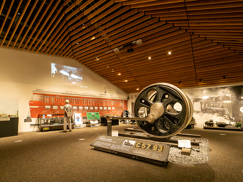 展示エリアを入るとC57型蒸気機関車の動輪。取材日は、国鉄OBによる解説が行われていた。
