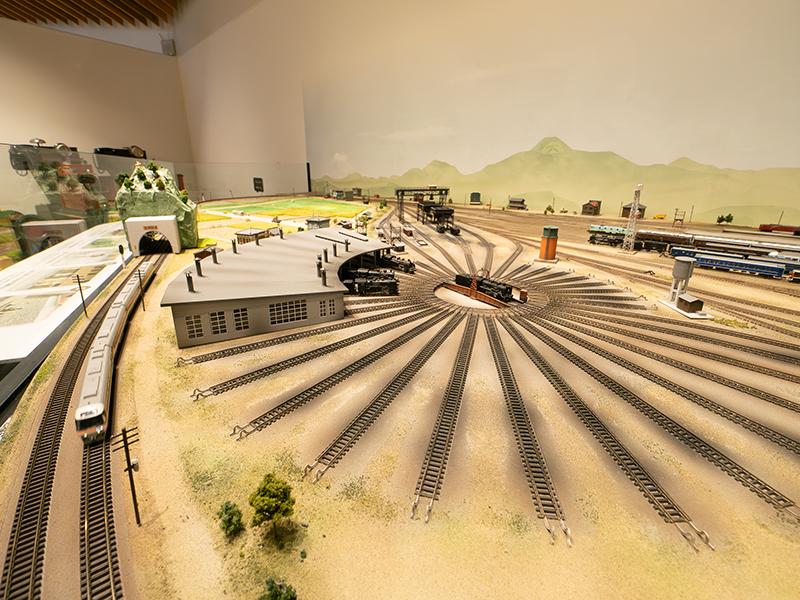 鉄道ジオラマのエリアでは、高架前と高架後の福知山を再現。両者を鉄道模型が往来する。