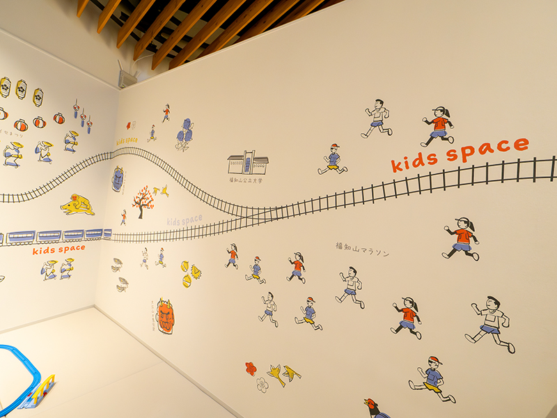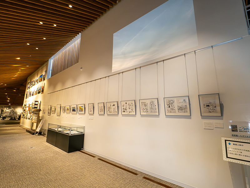 サブ会場となったフクレルは、2023年に新築された鉄道保存展示施設。元々は、市内にあった福知山鉄道館ポッポランドが、耐震性の問題から休館。資金不足から、収蔵していた展示品を市内各所に分散展示する方向で検討されていた。そこに、個人から2億円の寄付があったことで、福知山城公園内に新築されることとなり、現在に至る。施設内は、昭和25年に福知山鉄道管理局(全国で27カ所しか設置されなかった鉄道管理局のひとつ)が設置されてから、鉄道の街として栄えた福知山の歴史を振り返る貴重な資料や、”貴婦人”として国民に愛されたC57型蒸気機関車の動輪などが展示され、鉄道ファンならずとも楽しめる魅力的な施設。フクレルでは、キッズスペースの向かいの壁面を、こうの史代展の展示スペースとして、鉄道にまつわるイラストなどを中心に展示した。子どもが鉄道玩具などで遊ぶかたわら、大人がこうの作品を楽しむ光景は、フクレルならではのシーンだ。