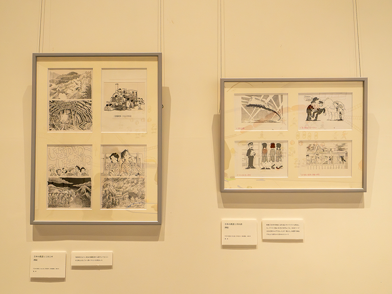 50枚以上の挿絵を制作した『日本の鉄道ことはじめ』(沢 和哉、1996年)や『日本の鉄道こぼれ話』(沢 和哉、1998年)のイラストを中心に展示。