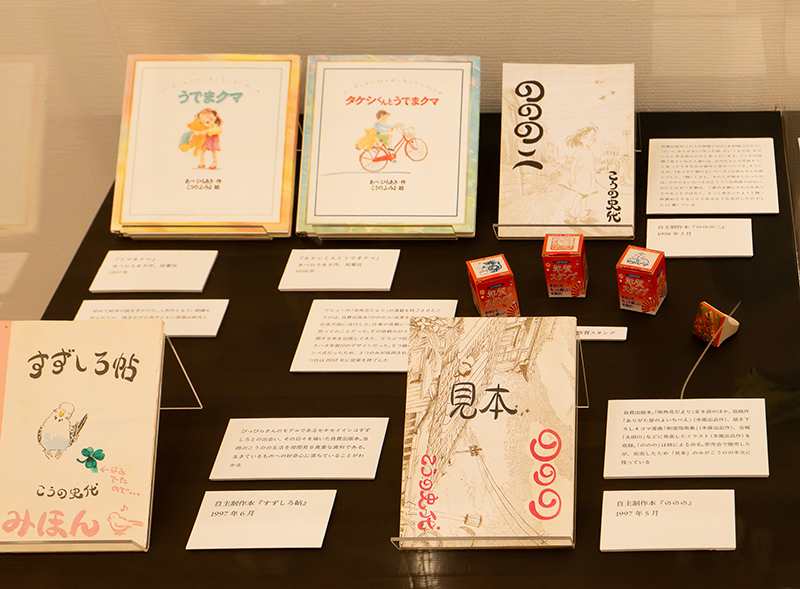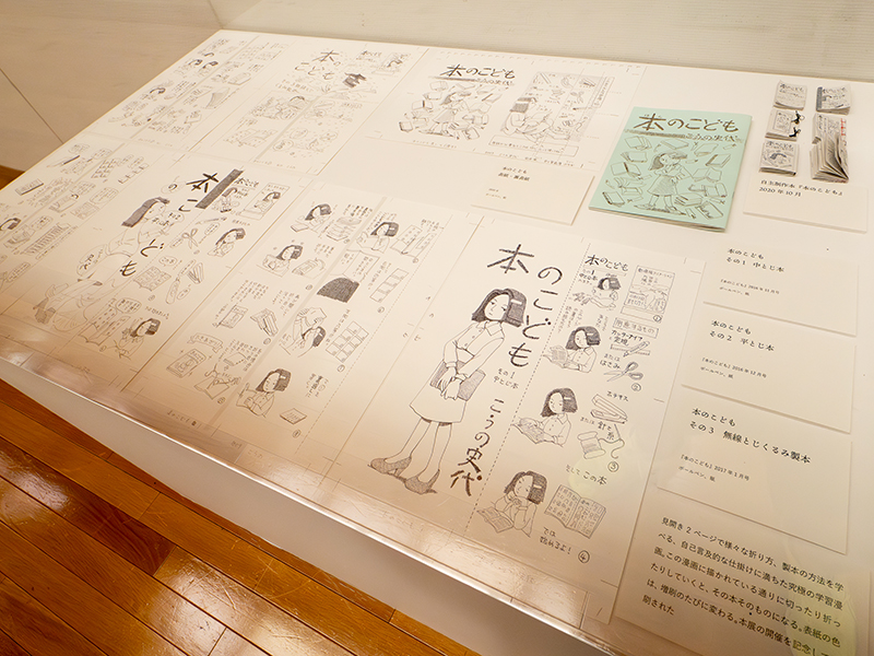 会場には、プロの漫画家になってからも製作し頒布していた「自主制作本」も展示。原稿執筆はもちろん、印刷から製本まで自分で行って完成させた本もあれば、同人誌印刷で制作された本もある。また、こうの史代が手作りした告知ペーパー「のののーと」も多数展示されている。一般の出版ベースに乗らない、こうの史代の挑戦も見られる。