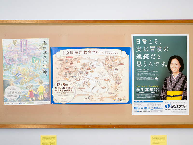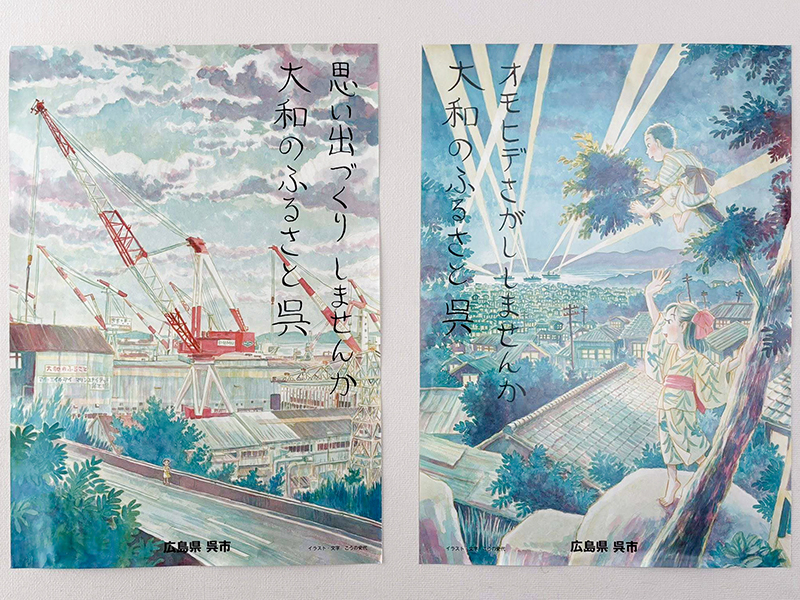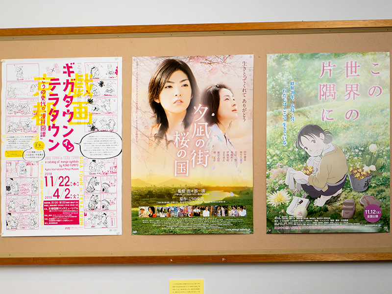 実写映画『夕凪の街 桜の国』、アニメーション映画『この世界の片隅に』の公開時の宣材ポスターや、こうの史代自身の写真が使用された「放送大学」のポスターに加えて、こうの作品の初原画展が行われた「コミティア」での原画展告知の大判ポスターもあり。大サイズで、こうの史代の絵を楽しめる貴重なポスターだ。また、こうの史代が描いた呉市の観光ポスターも、昭和初期バージョンと現代バージョンの2枚が並べて掲出され、昭和バージョンに描かれているのは『この世界の片隅に』で主人公すずの夫となる周作と、その姉・径子の幼き日の姿だという。