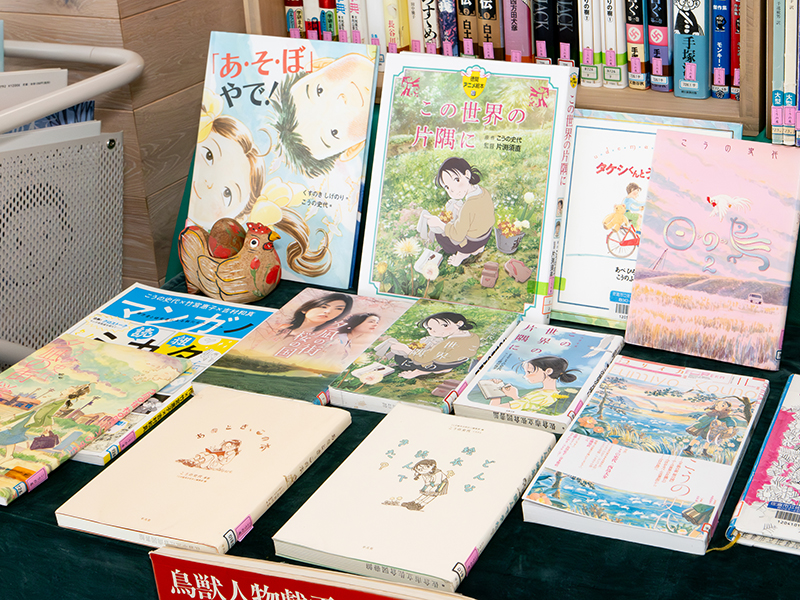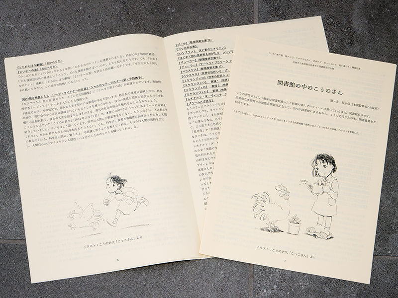 道路をはさんで隣接する複合施設「夢咲くら館」内の佐倉市立佐倉図書館も見逃せない。そこでは連携企画「図書館の中のこうのさん」が行われている。佐倉図書館の蔵書から、こうの史代がたずさわった書籍に加えて、こうの自身が読んできた本を選出して「夢咲くら館」1階に展示。さらに、本展監修者で小説家の福永信氏が解説を加えたリーフレットを制作し、展示スペースで無料配布している。