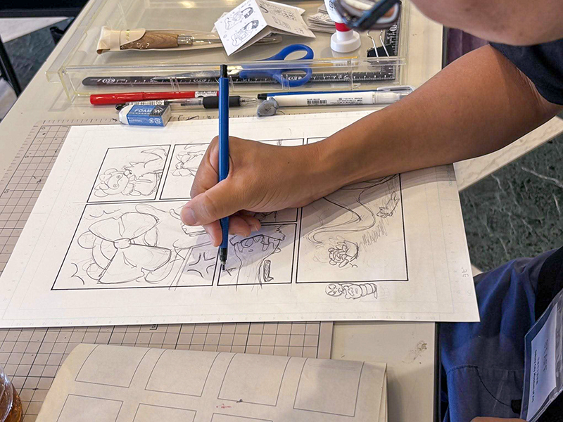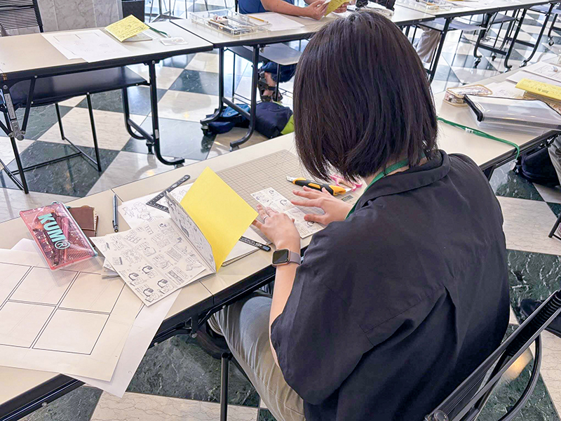 ひとつが8月30日(土)に開催された「本のこどもたち」ワークショップ。これは、10名の参加者が、リレー形式で漫画を描くというもの。まずウォーミングアップとして1コマずつリレー形式で作業し、最初の2ページを完成させた。続いて、3チームにわかれて同時進行でひとり1ページずつ担当する。最後にストーリーをつなぐ2ページを、こうの史代と福永信(本展監修者)が描き、全14ページのリレー漫画が完成。参加者が連係することで物語を紡ぎ、1本の漫画を完成させる挑戦的なワークショップだ。こうの自身によってコマ割りされページに漫画を描くのも、参加者にとって貴重な経験だっただろう。できあがった作品は、参加者各自が本の形に仕上げ、会場で販売も行う。最終的に、こうの史代が、プロとして執筆活動を行いながら続けていた「自主制作本」作りをすべて体験することになる。