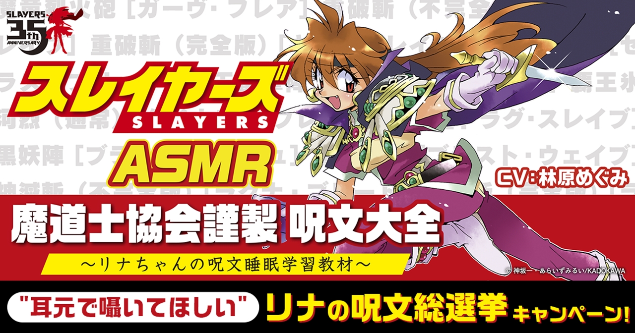 アニメーションも大ヒットし、今もなお根強い人気を誇る「スレイヤーズ」原作35周年記念として、『スレイヤーズ』のASMRボイスコンテンツ『スレイヤーズASMR 魔道士協会謹製 呪文大全 ~リナちゃんの呪文睡眠学習教材~』を制作が発表された。